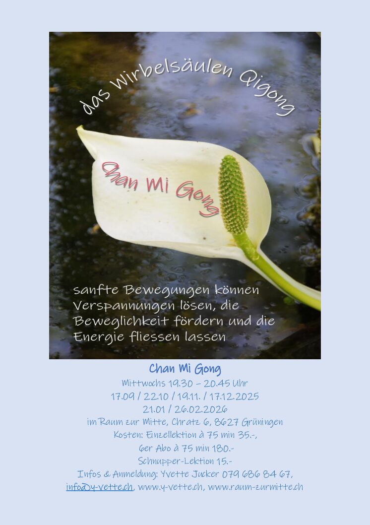 Chan Mi Gong ist eine besondere Schule des Qi Gong. Sie basiert auf sehr alten Übungspraktiken des Chinesischen Buddhismus. Ein weiches, achtsames Schwingen der Wirbelsäule steht im Zentrum. Die Übungen sind leicht zu lernen und führen schnell zu einer tiefgreifenden Entspannung und Qi-Erfahrung. In den letzten 15 Jahren wurde Chan Mi Gong vor allem durch die einfache und wirkungsvolle Basisübung bekannt. Chan Mi Gong ist ein sanfter Übungsweg, der über die äußere und innere Bewegung zu tiefer Ruhe, Stabilität und wachsender Lebens-Kraft und -Freude führt.