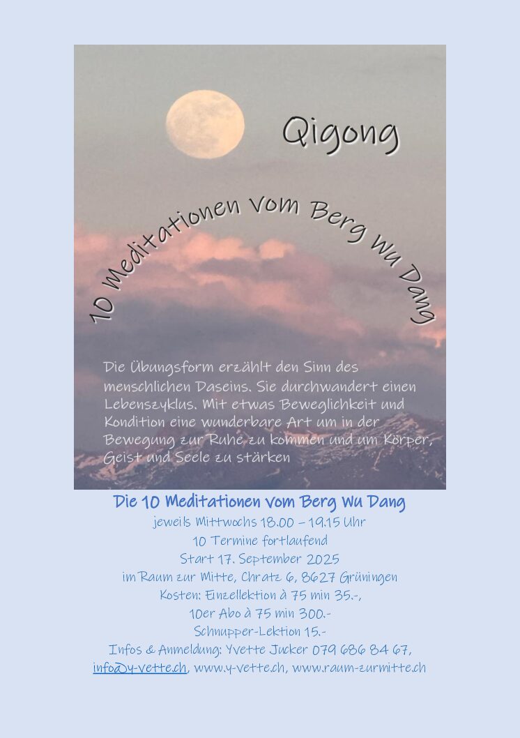 Qi Gong beruht auf der uralten chinesischen Tradition der zentralen Pflege und Kultivierung von Körper und Geist. Das Praktizieren von Qi Gong bringt mehr Freude, Leichtigkeit und Beweglichkeit in dein Leben. Qi Gong unterstützt die Selbstregulierung des Körpers, beruhigt den Atem und den Geist und kann von jedem, egal welchen Alters oder Gesundheitszustandes ausgeübt werden.